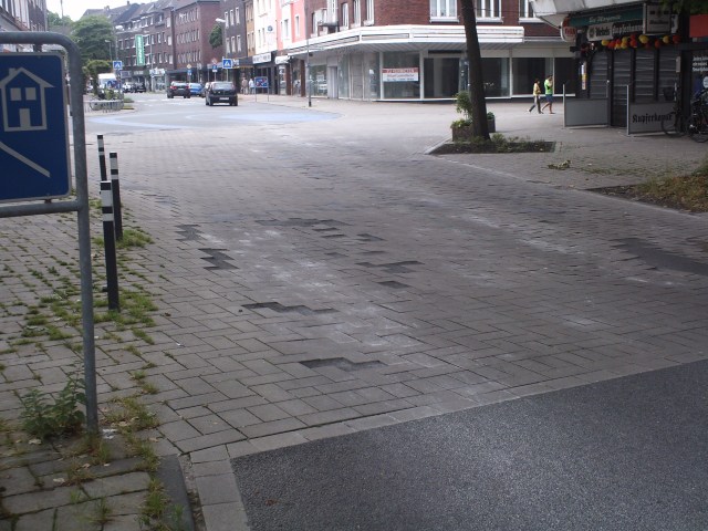 Wer sich mal das marode Pflaster am Rheinhausener Markt anschaut wird deutliche Spurrillen erkennen. Diese erinnern ziemlich stark an jene auf viel befahrenden Straßen mit LKW-Belastung. Was ja auch plausibel ist, denn mit schöner Regelmäßigkeit fahren LKW über die Duisburger und Krefelder Straße. Die Nummernschilder und auch die Art des Fahrzeugs zeigen deutlich, dass es sich um Durchgangsverkehr handelt. Insbesondere Container sind nicht für den örtlichen Handel bestimmt.
