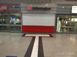 Vor einiger Zeit machte ich dann auch das unten angehängte Foto. Natürlich ist die Infostelle geschlossen, allerdings habe ich bei so manchem Informationsfluss, dass Gefühl, dass die deutsche Bahn so gut informiert, wie so eine geschlossene Infostelle. Nämlich gar nicht.