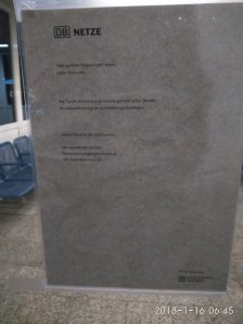 Als wäre es nicht bereits schlimm genug, auf dem Bahnsteig 3/4 in Kälte und im Wind stehen zu müssen, weil das Wartehäusche Nachts von Obdachlosen belegt wird und die olfaktorische Belästigung erheblich ist.