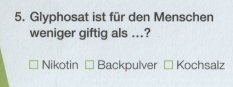 Die Quizfrage zur Giftigkeit von Glyphosat ist direkt in mehrfacher Hinsicht irreführend. Für den Anfang natürlich der Umstand, dass das Krebsrisiko unabhängig von der Giftigkeit ist. Asbest zum Beispiel ist nicht giftig. Dann wird hier populistisch zum Thema Giftigkeit gefragt, natürlich nur, um zu zeigen wie ungefährlich Glyphosat sein soll.