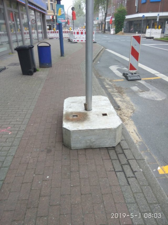 Auf der anderen Seite der Baustelle geht es weiter. Da wird das Fundament der Ampel einfach auf den Radweg gestellt: