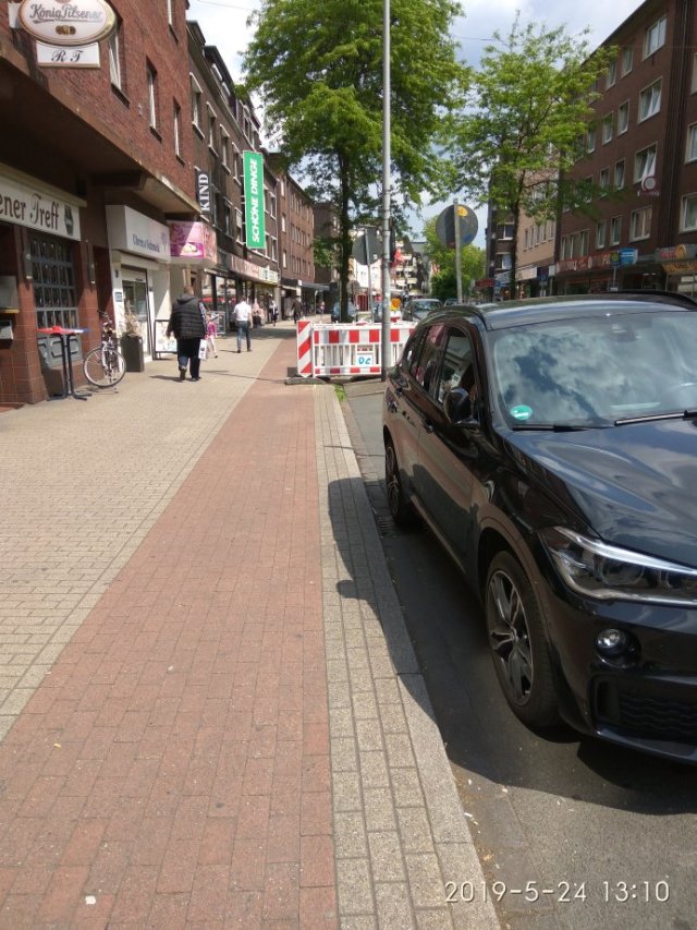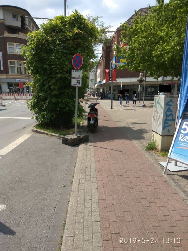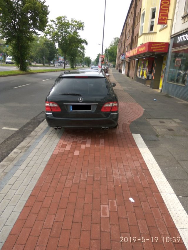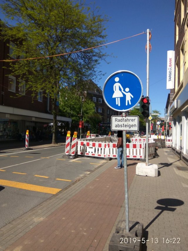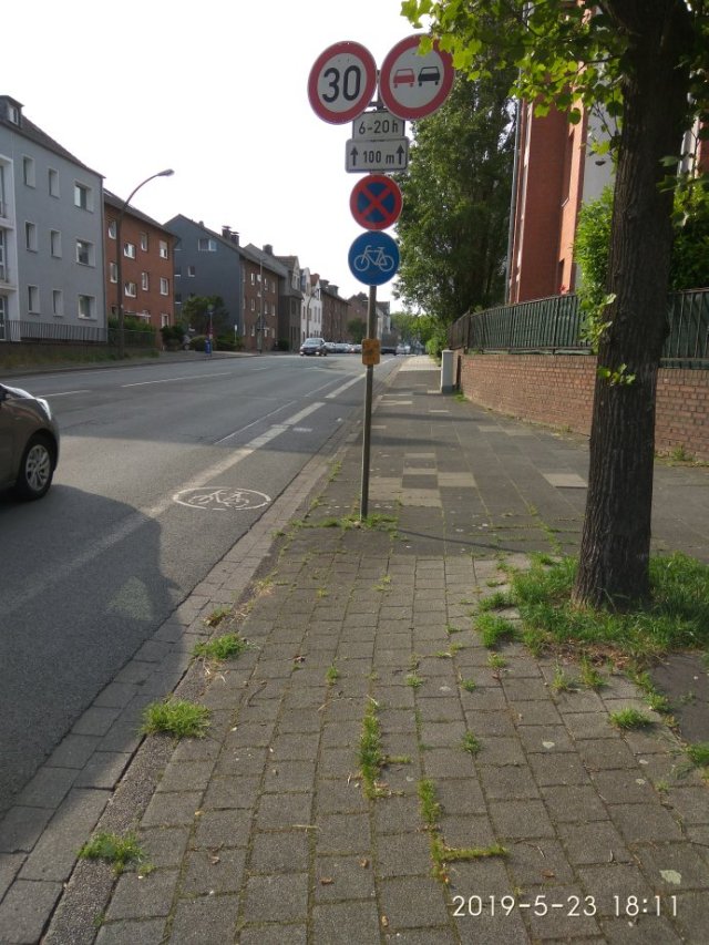 Auch nicht schlecht ist die Beschilderung, denn um das blaue Schild anbringen zu dürfen, sind bestimmte Vorgaben einzuhalten. Insbesondere in Hinblick auf die Breite eines Streifens auf der Fahrbahn, ansonsten ist das Schild unzulässig. Scheint bei der Stadt Duisburg aber nicht bekannt zu sein.