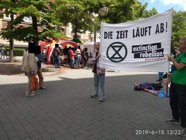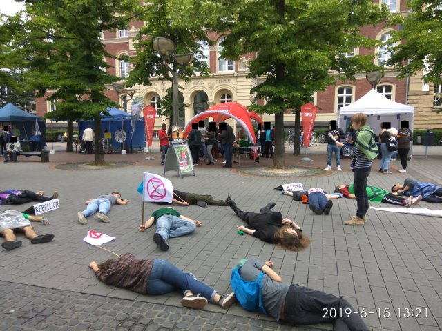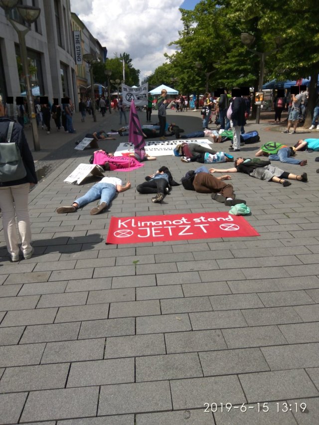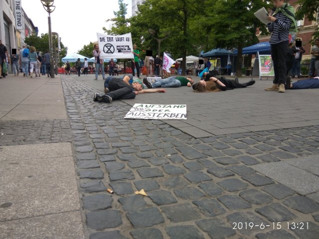 Vielleicht ist es Mut, vielleicht auch nur der Mut der Verzweifelung. Natürlich waren neben Fridays For Future Duisburg auch die ExtinctionRebellion vertreten. Diese fand sich um kurz nach 13 Uhr vor dem Forum zum Die-In [gemeinschaftliches Sterben] zusammen. Ich bin nicht sicher, ob es Zufall war oder Absicht, aber dies fand genau vor dem Stand der SPD statt, welche in Duisburg bedauerlicherweise nicht für eine fortschrittliche Klima- und Umweltpolitik bekannt ist. Man denke hier nur an den Baumschutz, den zahlreiche Menschen auf dem Umweltmarkt einforderten.