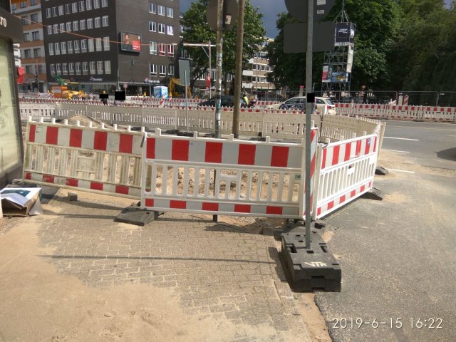 An der Friedrich-Wilhelm-Straße, im Bereich der Tonhallenstraße ist die Verkehrsführung durch die Baustelle höchst fahrlässig und typischerweise nur autofokussiert, an die Laufenden wurde wohl nicht gedacht. Und dies obwohl der Bereich zwischen Tiefgarage Forum und Friedrich-Wilhelm-Straße stark befahren ist. Der übliche bauliche gesicherte Bereich fehlt hier auf beiden Seiten.