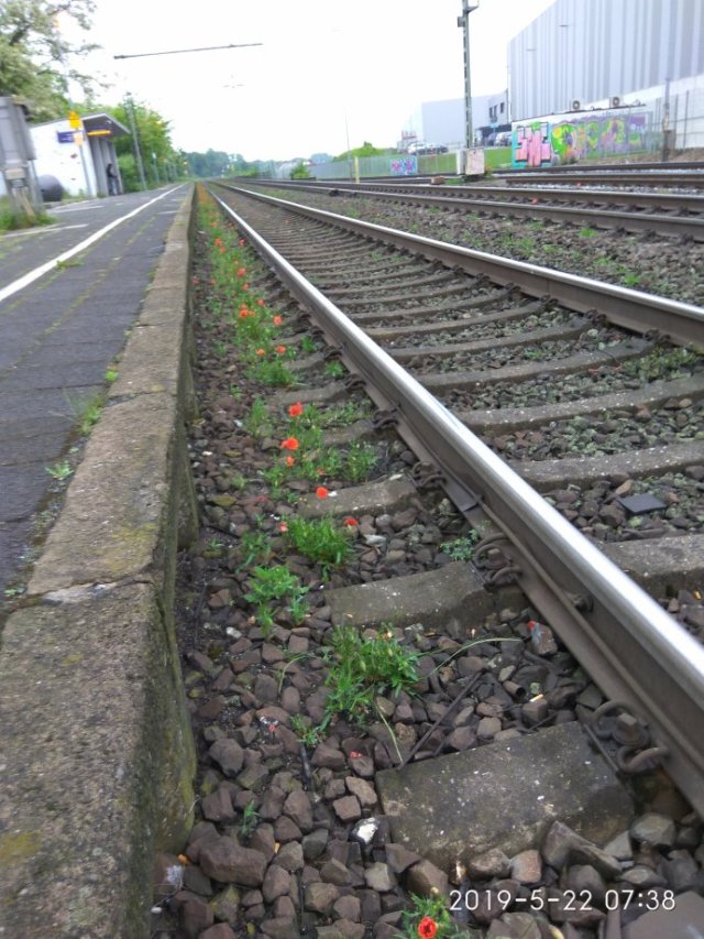 Wenn man viel unterwegs ist, sieht man immer wieder Sachen, die ungewöhnlich sind. So auch hier am Bahnhof Rheinhausen Ost. Dicht am Logport I und schlecht angebunden, denn pro Richtung halten hier nur zwei Mal die Stunde Regionalbahnen. Dafür hat mich verwundert, dass in diesem Bereich Mohn im Gleisbett wächst. Normalerweise vernichtet die Bahn dieses ja mit Pflanzengift, das u.a. Glyphosat enthält.