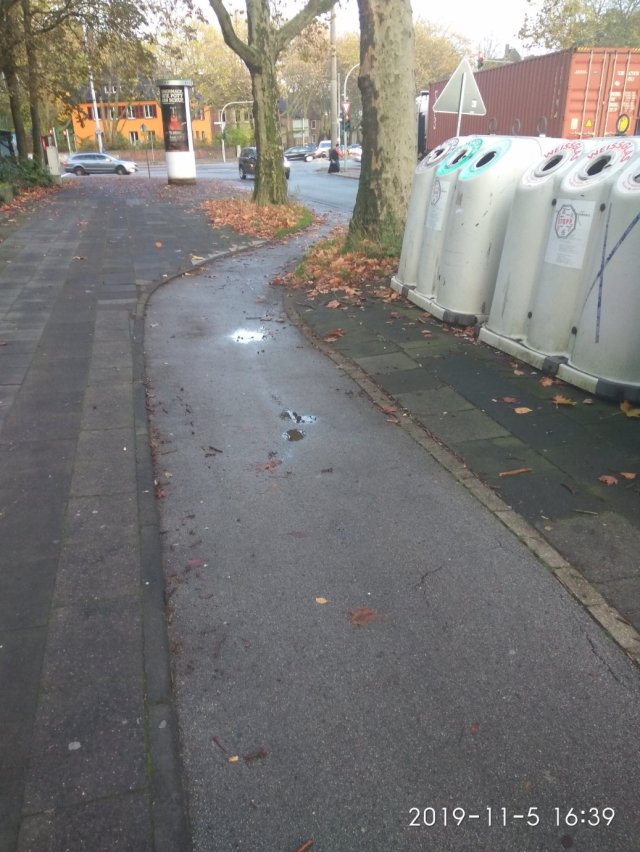 Ist natürlich nur ein Beispiel, ich kenne viele Stellen. An einigen müsste man über den Fußweg oder auf der Straße fahren, um die Ampel bei grün zu erwischen. Macht man den Schlenk mit muss man die Geschwindigkeit deutlich absenken, weil das mit normaler Fahrgeschwindigkeit nicht zu machen ist.