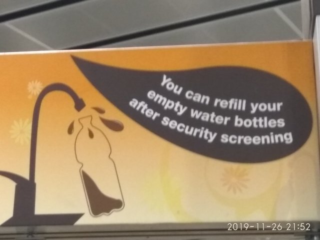 Am Beispiel Singapur sieht man, dass man wirklich serviceorientiert denken kann. Es wird sowohl Wasser angeboten, als auch darauf hingewiesen, dass man sich die Flaschen nach der Sicherheitskontrolle wieder befüllen kann. Selbst in Indonesien gibt es am Flughafen zumindest im öffentlichen Bereich Flaschenfüllstationen mit Trinkwasser. Das ist nicht nur praktisch, sondern auch umweltfreundlich.