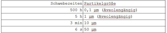Bei der Betrachtung von PM10 und PM2,5 wurde behauptet, das nur wenig emittiert wird. Dies wird natürlich bezweifelt, davon unabhängig wird aber auch ein Teil der Belastung übersehen. Durch Wirbelschleppen und andere vom Flugzeug bedingte Luftbewegungen wird Staub aufgewirbelt. Dieser fällt in Abhängigkeit der Größe sehr langsam zu Boden. Je kleiner die Partikel sind, desto länger brauchen diese um zum Boden zu sinken (siehe Tabelle 1).