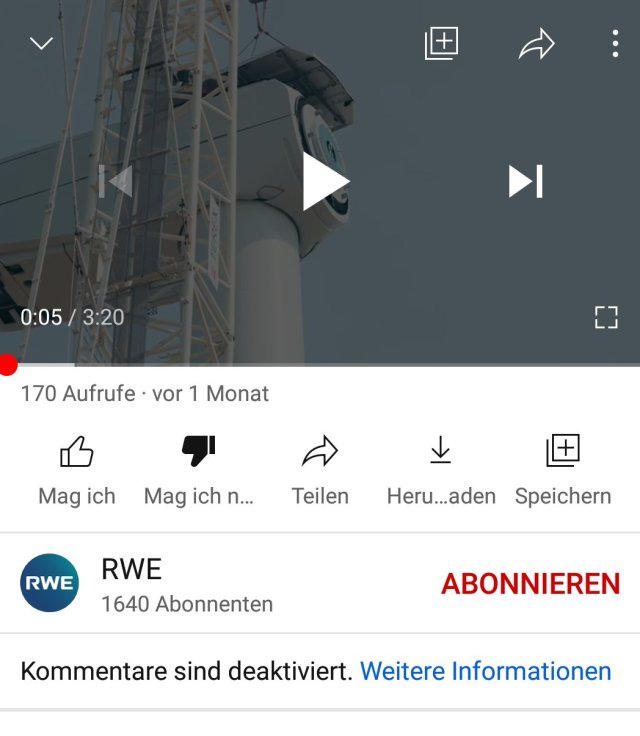 Greenwashing Spezialist RWE hat bei Youtube die Kommentare deaktiviert. Da fragt man sich warum man sich einer Diskussion nicht stellen will. Oder hat man gar die Sorge, dass man mit unangenehmen Fakten konfrontiert wird? Auch bei Twitter habe ich den Eindruck, dass man unliebsame Kommentare auf unsichtbar schaltet. Man will wohl verhindern, dass die RWE-Meinung hinterfragt wird.
