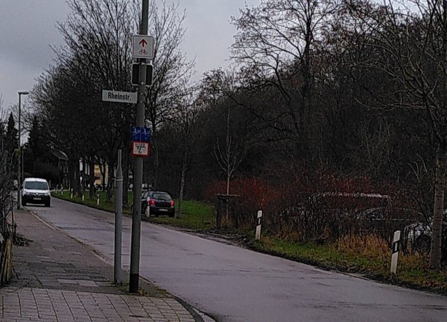 Seltsamerweise wird man vom Hinweisschild auf dem Pseudodeich neben der vorhandenen Osttangente auf den wesentlich konfliktärmeren Rheinradweg geleitet.