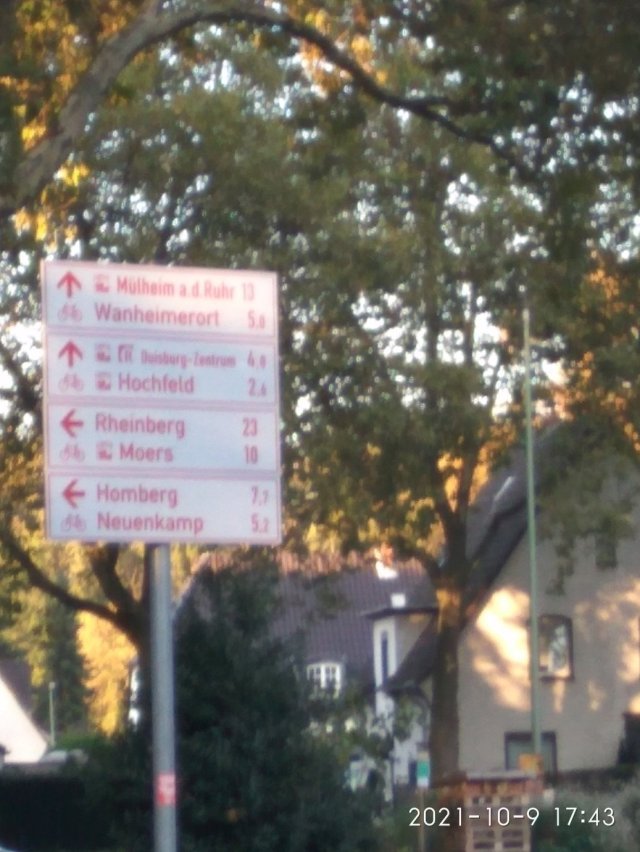 Vor einiger Zeit stand ich extrem verwundert an dem Hinweisschild für Radfahrende, welches an der Duisburger Straße (Kreuzstraße) als Richtung für Homberg zum Markt zeigt.