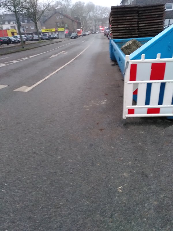 Die Bilder zeigen zwei abgestellte Container in einem Bereich, wo bereits nach StVO kein Parken von PKW zulässig ist, weil der Abstand von mind. 3 m zur durchgezogenen Linie nicht eingehalten wird.