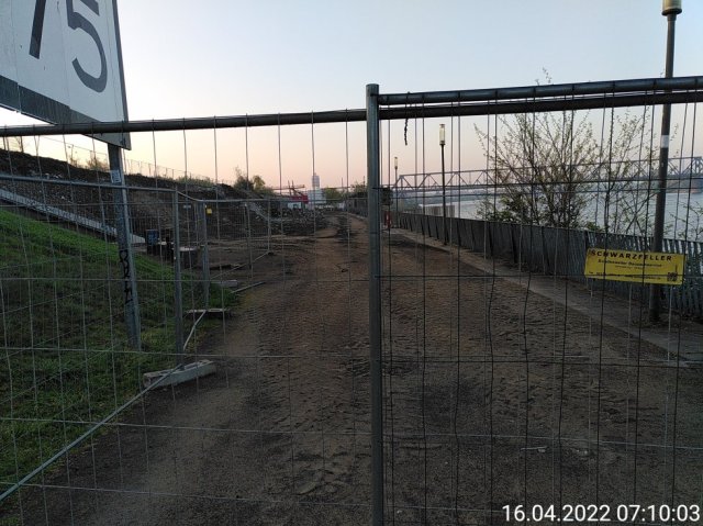 Auf der Seite wird auch etwas von Sperrung für längere Zeit geschrieben, was immer das genau bedeuten mag. Wenn man der Straße folgt, nach Rechts auf die Rudolf Schock Straße abbiegt, kommt man zu einem „Weg“, der zum Trampelpfad verkommen ist.
