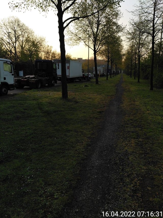 Alternativ kann man mit dem Fahrrad auf der linken Spur der Wörthstraße fahren, weil die Rechte zugeparkt ist. Zugeparkt mit LKW, deren Fahrende keinen Autohof haben und dort wohl übernachten.