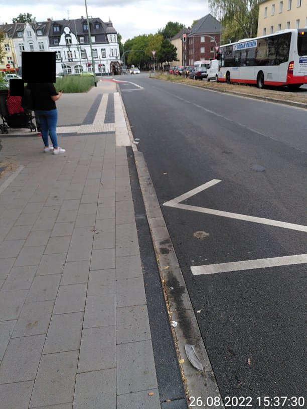 Die Sicherheit für Radfahrende wird vermindert, wenn man halbwegs getrennte Infrastruktur durch Farbe ersetzt und dabei die Radspur dichter an den KFZ-Verkehr heranrückt. Also typisch fahrradfeindliche Verkehrsplanung. Es ist davon auszugehen, dass es auf der anderen Seite genauso verläuft, denn auch dort wurde mir gegenüber bereits ein barrierfreier Umbau angekündigt. Das darf allerdings nicht dazu führen, dass man die Verkehrssicherheit für Radfahrende vermindert bzw. verschlechtert.