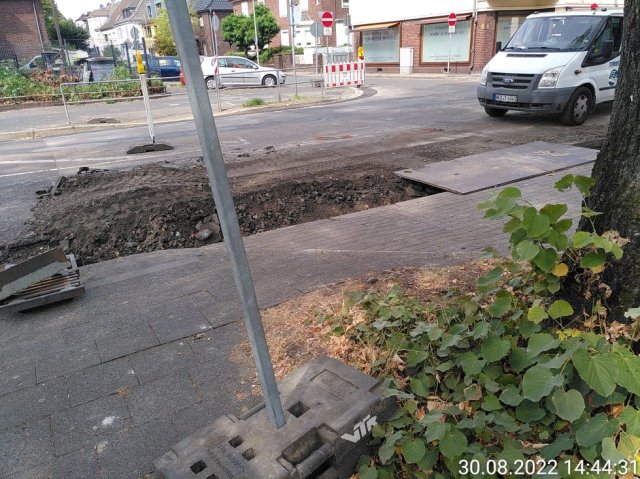 An der Grundschule Krefelder Straße gibt es eigentlich einen Überweg mit Mittelinsel, ein Zebrastreifen wäre natürlich sinnvoller, aber lassen wird das Thema. In der Baustelle hat man einen Überweg für Autofahrende gemacht, damit diese an der Schule parken können.