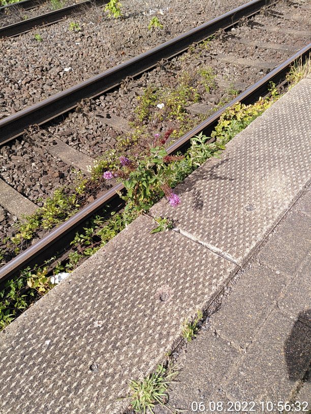 Am Bahnhof Viersen nahm ich das Bild unten auf. Man sieht einen Sommerflieder, der am Bahnsteig zwischen dem Fahrbereich der Züge und der Kante wächst. Natürlich sehr Kleinwüchsig, aber trotzdem blühend, was erstaunlich ist.