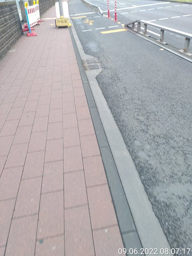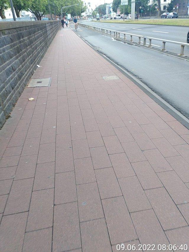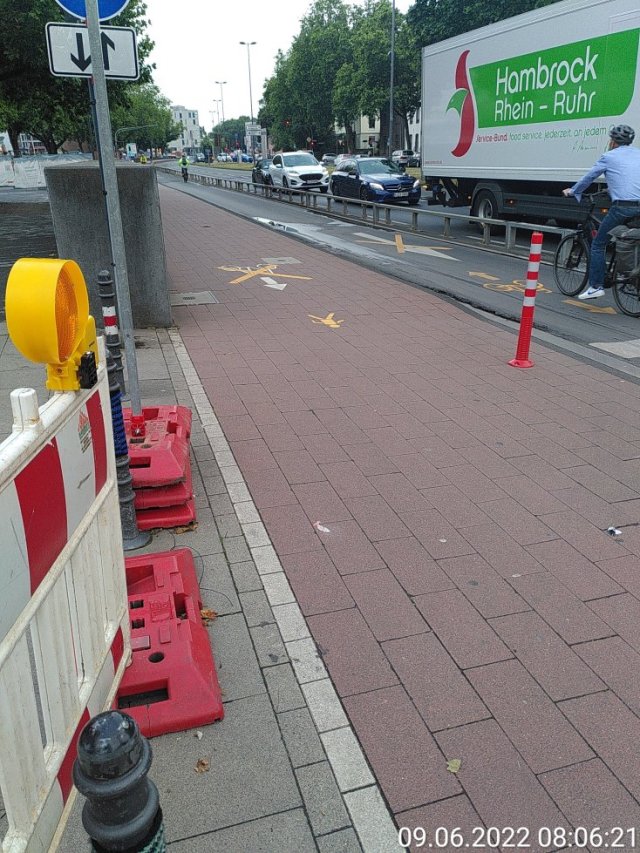 Die Passage liegt zwischen dem Dom und dem Schokoladenmuseum, kurz vor dem Museum. Wegen Bauarbeiten wurde der Gehbereich am Rheinufer gesperrt. Damit die Gehenden weiter können wurde der Radweg für Radfahrende gesperrt und für Gehende freigegeben und zugleich wurde eine Spur der Straße für Radfahrende abgetrennt, sodass sowohl Radfahrende, wie auch Gehende vergleichsweise problemlos durchkommen, trotz Einschränkungen.
