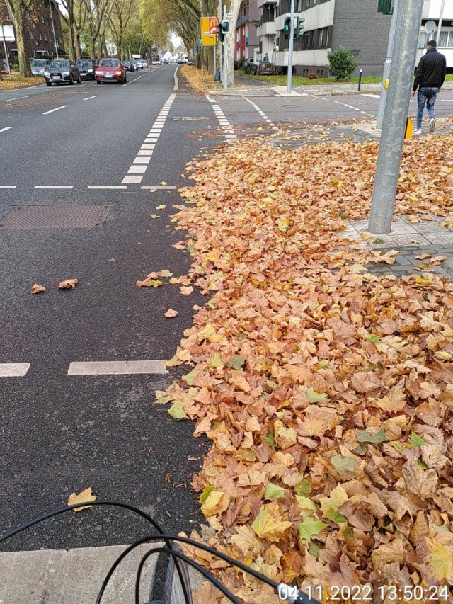 Am Nachmittag fuhr ich dann auf der Friedrich-Ebert-Straße. Dort war der Radfahrstreifen zu mehr als der Hälfte teilweise ziemlich hoch mit Laub bedeckt. Erstens kann Laub rutschig sein und zweitens können sich unter dem Laub Gegenstände befinden, welche die Nutzung gefährden. Hier insbesondere der Bereich zwischen Krefelder Straße bis Stünning Kreuzung.