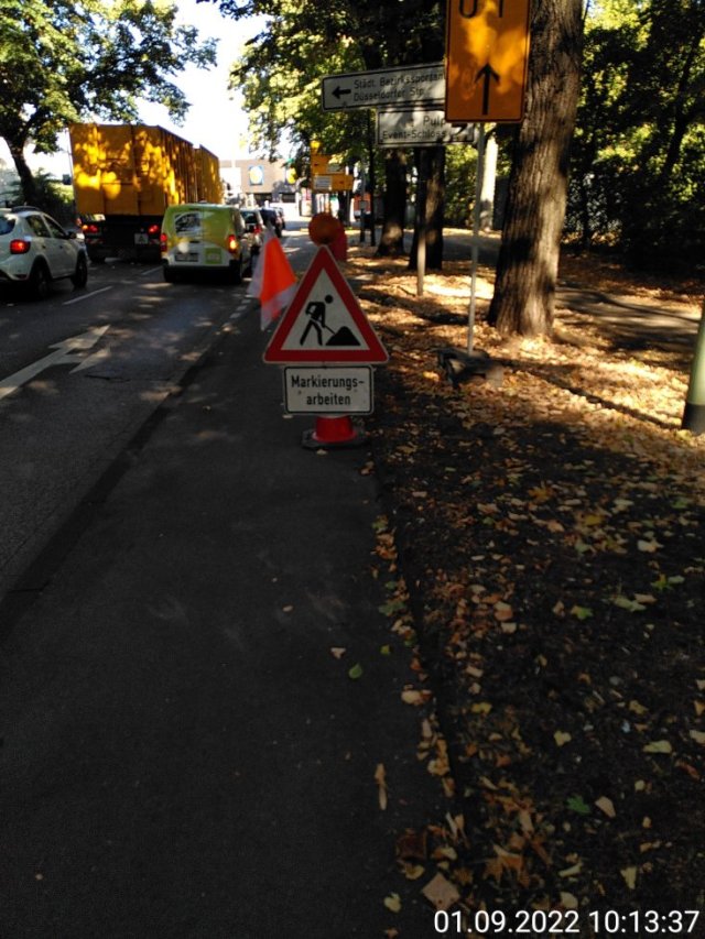 Es ist immer wieder bezeichnend, wie manche über Radwege denken. So sieht man auf dem Bild einen Hinweis Markierungsarbeiten, die allerdings auf der Straße durchgeführt wurden.