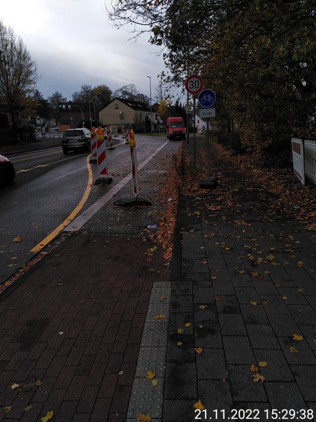 Einmal mehr stellt sich mir die Frage, wer so einen Unsinn zu verantworten hat. Kurz vor dem Flutweg, an dem zwei Schulen liegen, wurde die Straße ‚In den Peschen‘ in beide Richtungen ihres Fahrradstreifens beraubt.