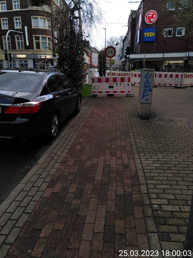 In der Fußgängerzone Rheinhausen im Bereich der Krefelder Straße befindet sich eine Baustelle. Wenn man dort aus der Zone kommt, findet sich eine Durchgangsverbot und ein Schild mit einem Pfeil nach Links. Die uneingeschränkt nutzbare Ampel befindet sich allerdings Rechts. Wenn man das Schild beachtet dürfte man diese nicht nutzen. Die Ampel befindet sich dagegen in der Baustelle, wodurch man nicht an den Drücker der Bettelampel kommt. Es gibt also keine legale Möglichkeit die Straße zu queren.