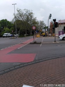 Was ich mich allerdings Frage ist, warum das Schild mitten auf der Kreuzung steht. Dient es an der Stelle der Überführung der Radfahrenden vom Radweg auf die Fahrbahn, damit diese ab Mitte der Kreuzung gefahrlos auf die Fahrbahn wechseln können? Dies ginge ja auch an vielen anderen Baustellen in Duisburg.