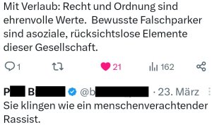 Entweder versucht die Person Rassismus zu verharmlosen, ist also selbst vielleicht rassistisch oder hat keine Ahnung vom Thema. Wohl eher soll dies der Abwehr dienen von richtiger und berechtigter Einschätzung von Falschparkenden.