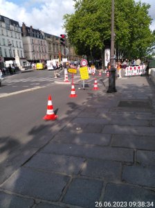 Das unten gezeigte Bild ist nicht direkt eine Baustelle, scheinbar fand dort ein privater Markt statt. Die Verkehrsführung ist allerdings genauso Panne wie in Duisburg. Ich bin nicht sicher, ob in Frankreich das VZ 254 die gleiche Bedeutung wie in Deutschland hat oder dadurch nur der Radweg gesperrt wird.