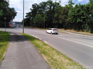 An der Stelle gibt es also weder eine Ampel, noch ein Zebrastreifen. Es gibt nicht einmal eine Mittelinsel, scheinbar ist hier die Abbiegespur wichtiger als die Verkehrssicherheit. Radverkehr und Fußverkehr werden gegeneinander ausgespielt.