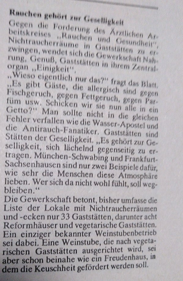 Und angehängt ist eine manipulative Werbeanzeige vom damaligen Konflikt um Restaurants und dass man dort hin kann ohne sich zu vergiften. Die Argumente kann man aus meiner Sicht sehr gut auf die heutigen Argumente um KFZ übertragen. Dabei zeigt die Erfahrung, dass es inzwischen gut funktioniert ohne Nikotinkonsum in Gaststätten.