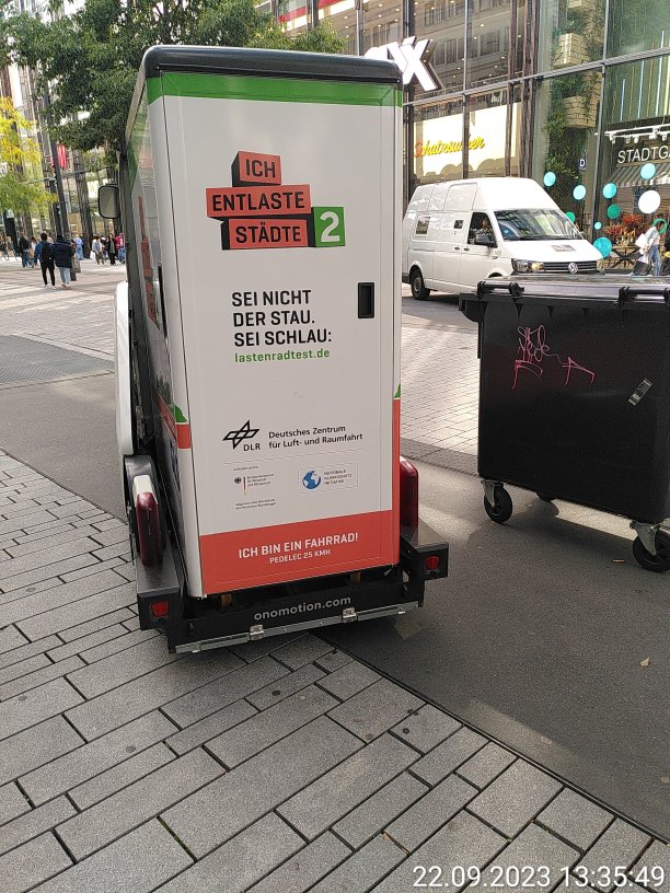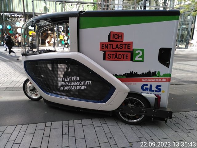 Für Umweltschutz und Klimaschutz muss die Verkehrswende kommen ein Teil davon ist die Nutzung von Lastenrädern. Neulich sah ich ein derartiges Vehikel in Düsseldorf. Scheinbar nimmt hier jemand an dem Projekt Lastenrad-Test teil.