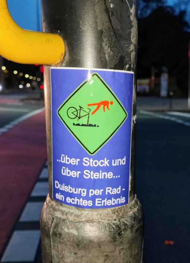 Der zweite Aufkleber, klebt dem Bild nach an einem Laternenpfahl, der ziemlich im Weg stehende aussah. Ich dachte erst es ging um die Ampel im Duisburger Süden, die Fehlverkehrsplaner mitten im Weg aufgestellt haben. Man sieht dort das Symbol für einen Mischweg und darunter den Text: „Vollpfosten Duisburg per Rad – ein echtes Erlebnis.“