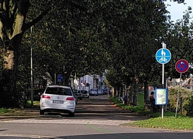 Man beachte auf dem Bild im Hintergrund das kleine Schild, was das halbseitige Parken auf dem baulichen Gehweg erlaubt, was zu der bizarren Situation führt, dass wenn man dort geht und mit dem Fahrrad unterwegs ist, dass KFZ-Fahrende trotzdem denken, dass sie Vorrang hätten. Die Fahrbahn zum Gehweg zu machen und dann darauf bewegte KFZ zuzulassen ist gelinde gesagt ziemlich gewagt. Selbst für die Autoschwurbelstadt Duisburg.