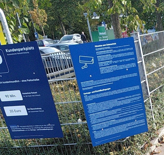 Und auch in Hinblick auf den Datenschutz stellt sich mir die Frage, ob da eine Kamera ist, welche die Nummernschilder erfasst und was dies für Fußverkehr bedeutet. Das Schild könnte also in den öffentlichen Bereich wirken und den Verkehr behindern.