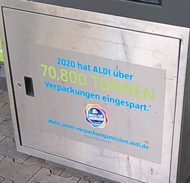 Auf einer Mülltonne an einem ALDI brüstet sich ALDI großspurig mit der Einsparung von Verpackungsmüll. Vermutlich stimmen die Zahlen sogar, aber das ist natürlich nur die halbe Wahrheit.