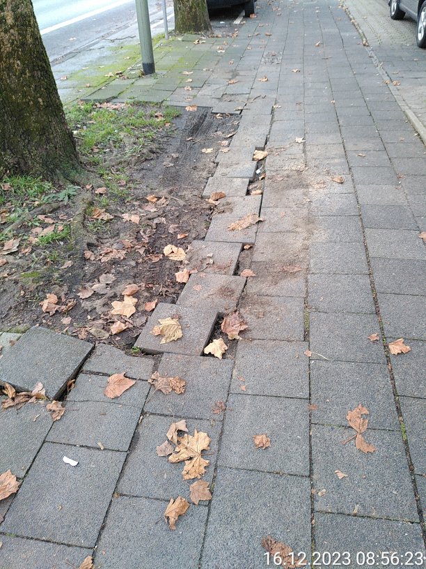 Wie man auf dem ersten Bild sieht, sind die Gehwegplatten stark verschoben, wodurch sich gefährliche Stolperstellen gebildet haben. Ebenfalls deutlich erkennbar ist der Reifenabdruck in der Baumscheibe. Das alles deutet darauf hin, dass hier regelmäßig KFZ über den nur 1,50 m breiten Gehweg fahren und weil das nicht reicht auch den Baum schädigen.