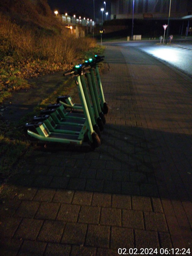 Wenn mich nicht alles täuscht, sind das wieder die Eyscooter der Firma Tier, welche da rechtswidrig den Gehweg blockieren. Das sind 5 Stück, die sicherlich nicht so ordentlich von Nutzenden auf dem Gehweg abgestellt wurden. Vielmehr ist klar, dass hier die Leihfirma verantwortlich sein dürfte, den Gehweg auf 70 cm zu verengen, was rechtswidriges Falschparken auf Gehweg mit Gefährdung ist, weil weniger als 1 m, als Mindestmaß für Gehwege verbleibt.