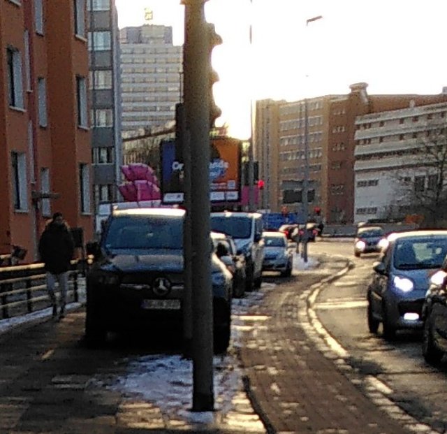 Dort parken KFZ auf dem Gehweg, wenn ich die Schilder richtig gesehen habe, sogar mit Erlaubnis der Stadt. Das Parken findet auch hier direkt rechts neben dem Radweg statt, der damit nicht mehr nutzungspflichtig ist, da offensichtlich ist, dass man einen Bereich, in dem Dooringgefahr besteht nicht zum Radfahren nutzen kann.