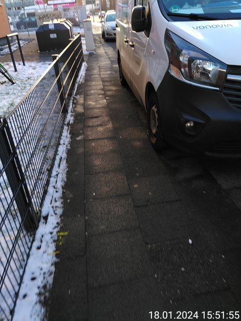 Wie man auf dem Bild sieht macht sich das Fahrzeug von Vonovia besonders breit, bzw. der Gehweg ist dort besonders eng. Aus meiner Sicht dürfte das Fahrzeug, selbst wenn es theoretisch durch die Stadt erlaubt wäre, dort nicht stehen. Einfach deshalb weil nicht mind. 1,5 m Restbreite verbleiben als unterste Grenze. Wie man erkennt verbleiben bei dem Vonovia-Fahrzeug an der engsten Stelle höchstens noch 90 cm, also nicht einmal genug für einen Rollstuhl.