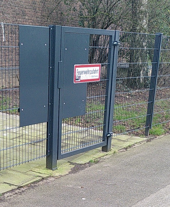 An der Grundschule Beethovenstraße gibt es einen Zaun im Bereich der Sporthalle. Dort steht an einem schmalen Törchen Feuerwehrzufahrt dran. Da stellt sich natürlich die Frage, wie dort die großen Feuerwehrfahrzeuge reinfahren sollen. Für mich mach das Schild an der Stelle keinen Sinn, es sei denn die Feuerwehr Duisburg hätte so etwas wie Feuerwehrlastenräder. Kann ich mir in Duisburg aber nicht so recht vorstellen.