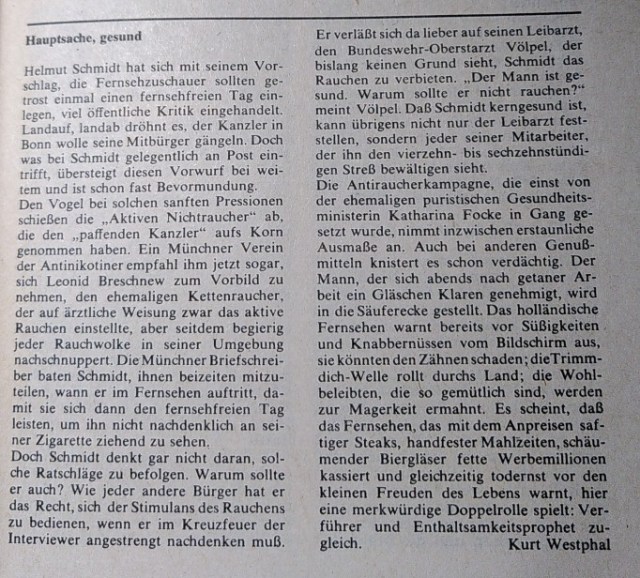 Wobei ich mich frage, welcher Kurt Westphal dies damals verfasst hat. Sollte gar einer von der SED im Westen Nikotin empfohlen haben? Oder war es ein ehemaliger Nazi? Wer auch immer sich hinter dem Namen verbirgt war wohl jemand, der manipulieren wollte. Sei es nun Klimaschutz oder KFZ-Verkehr, überall bemerkt man deutlich diese Bestrebungen fatale Konsequenzen zu verharmlosen.