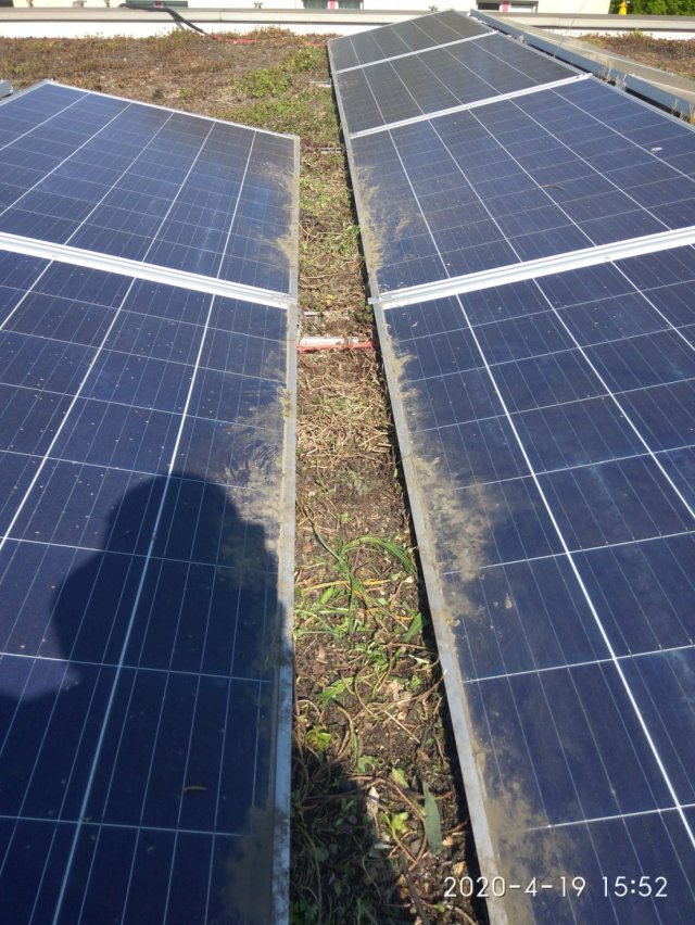 Im Rahmen der Recherchen fand ich dann auch verschiedene Systeme für Gründächer, welche einen deutlichen Abstand zum Gründach haben und in allen Publikationen, die ich bisher las, wird auch der Bewuchs erwähnt und welche Voraussetzungen es gibt, damit dieser kontrolliert werden kann. Die installierte Anlage erfüllt diese Voraussetzungen nicht. Der Abstand zwischen der Doppelreihe entspricht nicht den Vorgaben, welche aus dem Arbeitsschutz kommen. Hier wird von mind. 60 cm ausgegangen und zudem sollte für die Pflege alles gut erreichbar sein.