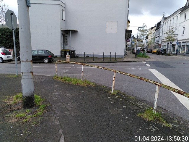 Das Bild unten stammt von einer Kreuzung nach am Bahnhof Rheinhausen. Auf der einen Seite hat man eine Absperrung, welche die Überquerung verhindert auf der anderen Seite hat man Poller, die eigentlich Fahrradparkplätze sein sollen. Natürlich, wie in Duisburg üblich auf dem Gehweg.