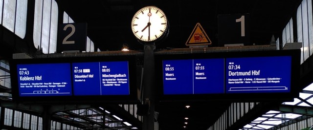 Dass die elektronische Hinweistafeln in Duisburg immer wieder falsche Informationen anzeigen ist bekannt und erlebe ich immer wieder, diesmal war es aber anders, denn ein Stück weiter zeigte die Tafel genau die umgekehrte Zuordnung der Züge zu den Gleisen an.