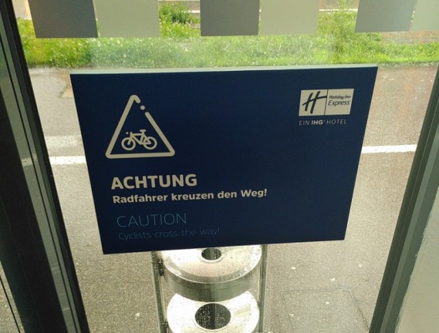 Positiv ist ja zumindest, dass man sich hier Gedanken gemacht hat, wobei ich mich frage, ob ein Achtung Radfahrende Schild bei der Ausfahrt vom Hotel steht.