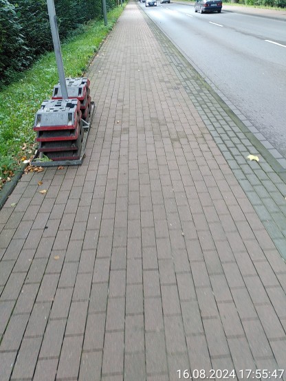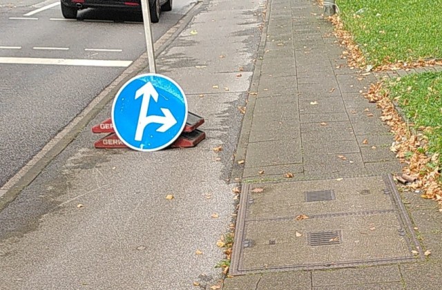 Ein Teilstück der Moerser Straße in Hochemmerich ist derzeit gesperrt, weil man die Fahrbahndecke neu macht. Wie üblich hat man wieder völlig rechtswidrig Schilder auf den Gehweg gestellt. RSA 21 sag mind. 1 m. Die Gehwegplatten sind 40er, dass heißt die Gesamtbreite des Gehwegs ist gerade einmal 1,2 m und der Schilderfuß ist ist 40 cm breit. Folglich ist das ein klarer Verstoß gegen RSA 21. Auch der Radweg ist zu schmal für Schilder, also hätte das Schild nur auf der Fahrbahn oder im Vorgarten aufgestellt werden dürfen.