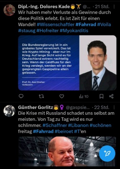 Ab und an suche ich bei murX (früher Twitter) nach bestimmten # wie etwa #Fahrrad. Neben interessanten Beiträgen sah ich letztens auch zwei Beiträge, die gar nicht zum Thema Fahrrad passen, aber den #Fahrrad hatten und noch dazu weitere. Inhaltlich ist hier offensichtlich, dass dahinter die ruzzischen Trollfabriken stecken. Scheinbar versucht man nun die Verbreitung dieser Propaganda zu erreichen indem man willkürliche # anfügt. Der gezeigte Screenshot ist leider nur ein Beispiel. Man erkennt diese Beiträge recht schnell, aber es ist offensichtlich, dass murX zu wenig gegen die Trollfabriken unternimmt. Eigentlich müsste solche Beiträge auch eine halbwegs gut programmierte KI ohne Probleme finden.