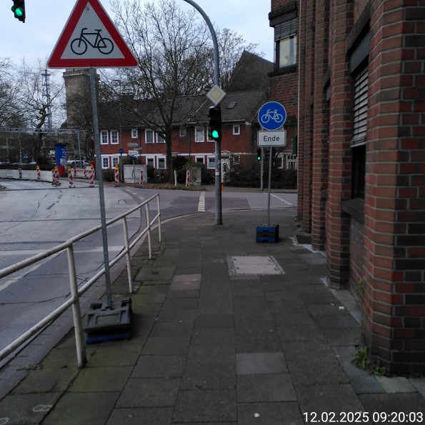 Und richtig bizarr wird dann die Energieverschwendung für eine Fußverkehrsampel, die nirgendwo hinführt außer auf ein sehr kurzes Stück Gehweg, was nirgendwo hinführt. Wozu dann also überhaupt eine Ampel? Den Strom hätte man sich auch sparen können.