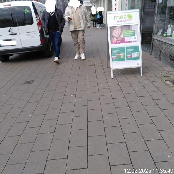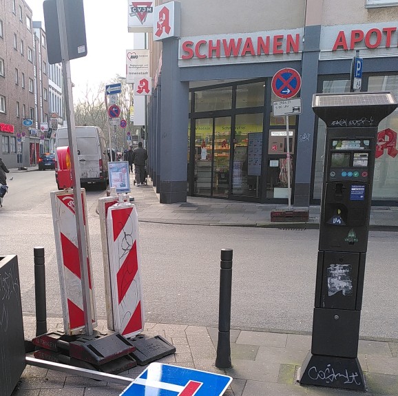 Die Schwanen Apotheke stellt auf einen ohnehin schon schmalen Gehweg noch eine Schild und blockiert damit den Gehweg ca. zur Hälfte. Es verbleiben ca. noch 80 cm, soweit ich das erkennen kann, also zu wenig für manche Rollstühle und Rollatoren. Scheinbar ist das Werbebedürfnis wichtiger, als die Rücksichtnahme. Keine Ahnung ob das genehmigt wurde, in Duisburg ist ja alles möglich, zulässig ist das so oder so nicht.